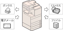 スキャナー部で取り込んだ紙文書を、Eメール、Iファクスを利用して他の人に配布できます。文書のやりとりが効率的になります。また、Eメールや、FTP、SMB、WebDAVなどのファイルサーバーに送信すると、紙文書が電子化されるので、コンピューターでの閲覧やデータ管理にご利用いただけます。