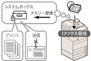 受信したIファクス文書をプリントせずに、システムボックスに保存するように設定できます(メモリー受信)。システムボックスにメモリー受信された文書は、相手先やページ数などの詳細情報を確認したあと、好きなときにプリントしたり、別の宛先に再送信したりできます。