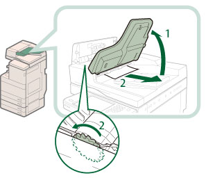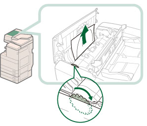 緑色のつまみを左に回して、つまっている原稿を排紙トレイから取り除きます。