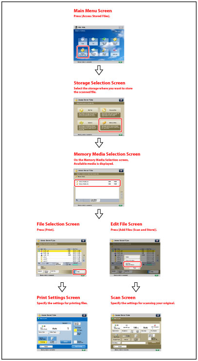 For the procedure regarding [Add Files (Scan and Store)] and instructions on operating the Scan screen, see "Adding a File (Scan and Store)" and "Flow of Scan and Store Operations."