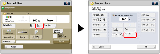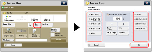 Press [Copy Ratio] → adjust the zoom ratio using [-] and [+] → press [OK].