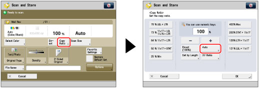 Select this mode to have the machine automatically select the zoom ratio based on the selected record size. The available zoom ratios are from 25% to 400% for the Mail Box function, and from 50% to 200% for the Advanced Space, Network, or Memory Media function. The same zoom ratio is used for the horizontal and vertical axes.