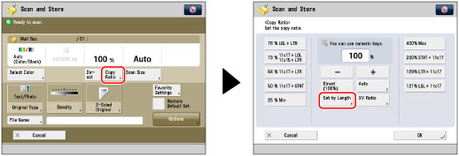 This mode enables you to enlarge or reduce originals by individually entering the dimensions of the original and output paper. You can set a copy (zoom) ratio from 25% to 400% if you place the original on the platen glass, or from 25% to 200% if you place the original in the feeder.