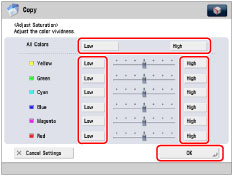 Press [Low] or [High] to adjust the saturation level of the selected colour or all the colours → press [OK].