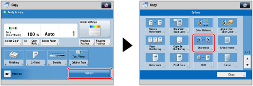 You can adjust the sharpness to copy text and lines with a sharper contrast. You can also reduce the sharpness for the half-tone dots of printed photos, etc. to copy with a softer image.