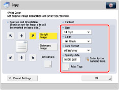 You can also adjust the position of the date. (See "Registering/Editing/Deleting User-Defined Text for Page Numbers and Watermarks.")