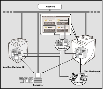 The Advanced Space of imageRUNNER ADVANCE is a storage location for sharing information. It enables paperless information communication by storing scanned documents in it and allowing users to access them from their PCs.