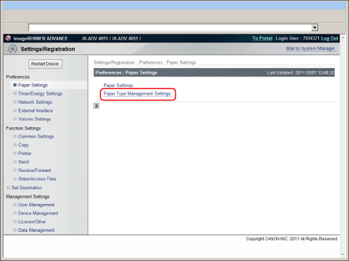 Click [Settings/Registration] → select [Paper Settings] for <Preferences> → click [Paper Type Management Settings].