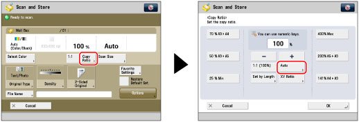 Select this mode to have the machine automatically select the zoom ratio based on the selected record size. The available zoom ratios are from 25% to 400% for the Mail Box function, and from 50% to 200% for the Advanced Space, Network, or Memory Media function. The same zoom ratio is used for the horizontal and vertical axes.
