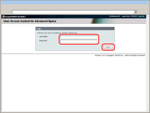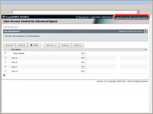 Click [Log Out from User Access Control] to finish the operation. If you close the Web browser page without clicking [Log Out from User Access Control], the logout process will not be performed correctly. In this case, note that you will not be able to log in again for approximately 30 minutes.