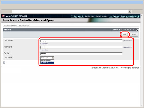 Only the Advanced Space administrator can register/edit the user information on the [User Management] page of [User Access Control for Advanced Space]. General users can only change their own password. (See "Editing User Information by General Users.")
