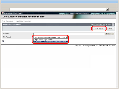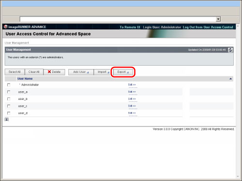 Export user information when you back up data on the Advanced Space to use on another imageRUNNER ADVANCE series machine. You can use the data stored on the Advanced Space if you import the user information into the other machine. For information on backing up/restoring stored data, see "Backing Up Stored Data."