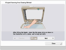 If originals are scanned using the feeder, there may be some cases in which the original cannot be scanned properly, or streaks appear on the copies. In this case, clean the original scanning area by following the directions displayed in [Original Scanning Area Cleaning Method] in [Adjustment/Maintenance] (Settings/Registration).