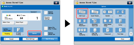 If you select [Print on Front Side], [Print on Back Side], or [Print on Both Sides] for the front and/or back cover, the machine inserts a sheet of paper from the paper source that you selected in step 3 to be used as the print's front and/or back cover. The machine then prints on the front side, back side, or both sides of the front and/or back cover.