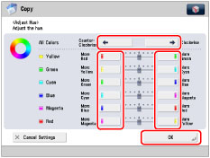 To adjust the hue level of each colour, press [More Red], [More Green], [More Yellow], [More Cyan], [More Blue], or [More Magenta] for each colour.