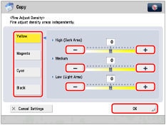 Select the colour that you want to adjust → press [-] or [+] to adjust the density level for the darker (high), medium, and lighter (low) density areas → press [OK].