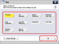You can change or specify the settings for [Copy Ratio], [2-Sided], [Density], and [Original Type] before scanning the next batch of originals (i.e., between batches). To change the settings, press [Change Settings]. Select the mode to change → after pressing [Change], change the settings → press [OK].