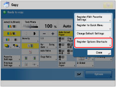 You can create shortcuts to frequently used functions in [Options]. These shortcuts then appear on the Express Copy Basic Features screen.