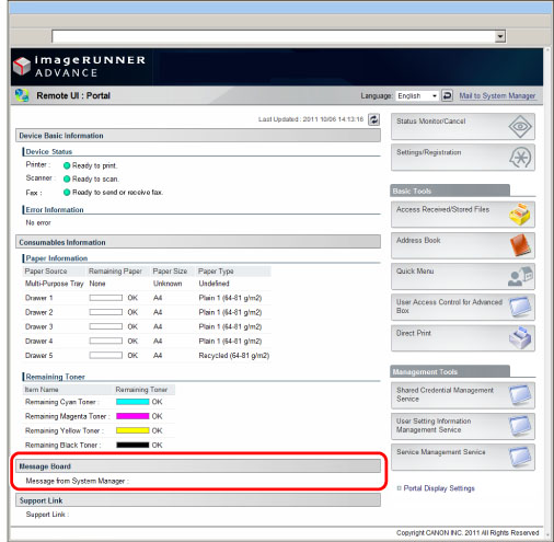 If you select [Display on Portal], the message board is displayed on the portal page of the Remote UI.