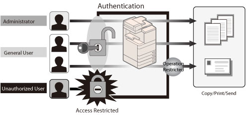 The authentication on this machine requests user information (user name and password) when users access the machine, and verifies that information. Only an authorized user that has successfully passed the authentication can operate the machine. You can prevent access by unauthorized users by managing the users for the machine. To use the authentication mode, you must first register the information for administrators and general users.