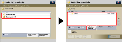 Sélectionner l'espace de stockage souhaité → sélectionner le niveau de dossier souhaité → appuyer sur [Opérations du dossier].