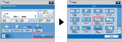 Si l'on sélectionne [Vierge] pour la couverture de dessus et/ou de dessous, la machine insère une feuille prélevée de la source sélectionnée à l'étape 3, feuille qui servira de couverture de dessus/dessous.