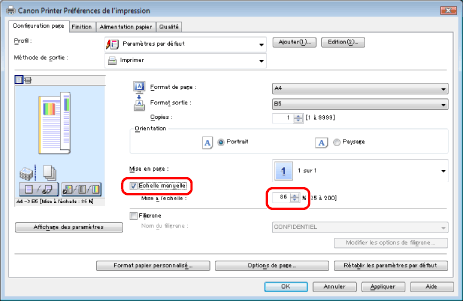 La mise à l'échelle du document s'effectue automatiquement en fonction des paramètres définis dans [Format de page] et [Format sortie].