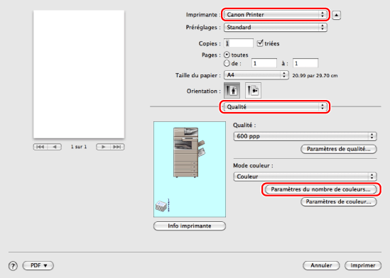 Sélectionner l'imprimante → [Qualité] → cliquer sur [Paramètres du nombre de couleurs].