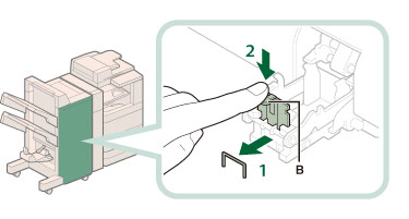 Après avoir éliminer le bourrage d'agrafes, veiller à remettre manuellement les agrafes en place dans l'agrafeuse avec piqûre à cheval. (Voir "Repositionnement des agrafes pour le mode piqûre à cheval".)