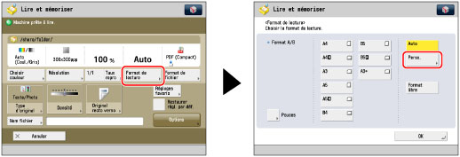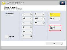 Il est possible de spécifier manuellement un format de lecture lors de la lecture d'originaux ne pouvant pas être détectés à l'aide de [Auto]. On peut également mémoriser le format spécifié.