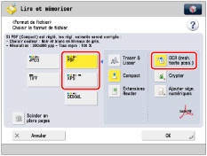 Si le format de fichier sélectionné est [OCR (rech. texte poss.)], les documents ne peuvent être lus qu'au taux de reproduction de [1/1 (100 %)] ou [Auto].