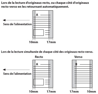 Si l'on a placé les originaux dans le chargeur et que les sections en couleur se trouvent uniquement dans la zone représentée sur l'illustration ci-dessous