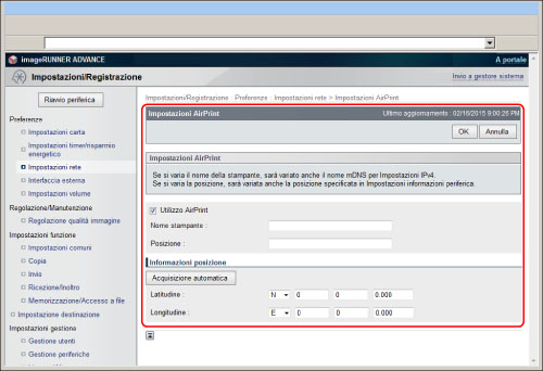 Per controllare la posizione, leggere il valore corrispondente alla posizione in [Impostazioni informazioni periferica] ([Gestione periferiche] in [Impostazioni gestione] (Impostazioni/Registrazione)).