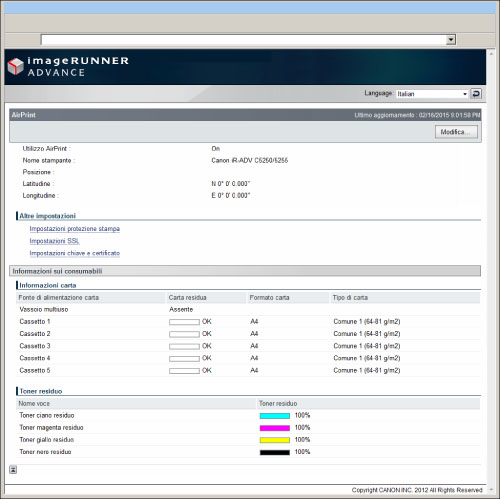 Consente di controllare i valori immessi nelle impostazioni di AirPrint, come il nome e la posizione della macchina. È possibile fare clic su [Modifica...] per modificare le impostazioni.