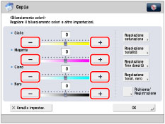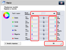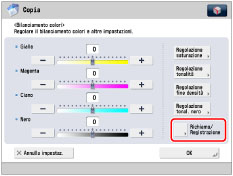 Se si seleziona un tasto in cui non sono state memorizzate impostazioni di bilanciamento colori, [OK] è ombreggiato e non è possibile premerlo. È possibile selezionare un altro tasto in cui sono state memorizzate impostazioni di bilanciamento colori o premere [Annulla].