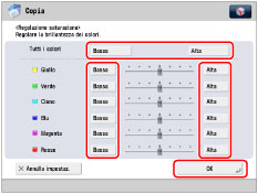 Premere [Bassa] o [Alta] per regolare il livello di saturazione del colore selezionato o di tutti i colori → premere [OK].