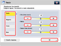 Selezionare il colore che si desidera regolare → premere [-] o [+] per regolare il livello di densità per le aree di densità più scura (alta), media e più chiara (bassa) → premere [OK].