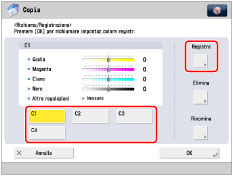 Selezionare un tasto da ([C1] a [C4]) per memorizzare le impostazioni di bilanciamento colori → premere [Registra].