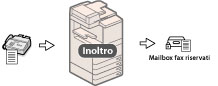 È possibile predisporre la macchina ad inoltrare automaticamente i fax ricevuti, rispondenti alle condizioni specificate di inoltro, alle destinazioni indicate utilizzando i parametri di invio desiderati. Si possono anche inoltrare i fax ricevuti ad altre macchine (funzione rilancio) oppure, nel caso di documenti riservati, è possibile programmare automaticamente la loro registrazione nella mailbox per fax riservati. È inoltre possibile attivare l'inoltro automatico ad un'ora programmata. Poiché è possibile inoltrare alle destinazioni desiderate anche i documenti ricevuti che non corrispondono alle condizioni di inoltro, si può utilizzare questa funzione per ordinare i documenti fax ricevuti e distribuirli alle destinazioni appropriate.