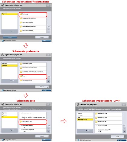 sul pannello comandi e collegandosi come amministratore mediante il pannello digitale. Per informazioni sui tipi di amministratori, vedere "Impostazioni amministratore".Specificare le impostazioni in [Rete] in [Preferenze] secondo l'ambiente di rete in uso. Le seguenti schermate illustrano il flusso delle operazioni per specificare le impostazioni di rete.
