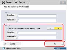 Se <Utilizzo DHCPv6> è stato impostato su 'On' al punto 7, il nome di dominio impostato manualmente viene sovrascritto. Anche se si imposta <Utilizzo stesso nome host/nome dominio di IPv4> su 'On', viene utilizzato il nome di dominio ottenuto dal server DHCPv6.