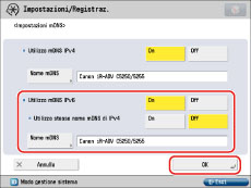 Se si abilita <Utilizzo mDNS IPv6> al punto 10, accertarsi che sulla rete non vi siano periferiche il cui nome host e nome mDNS nelle impostazioni del nome host/di dominio DNS siano identici. I valori non univoci impostati manualmente vengono automaticamente modificati perché siano univoci.