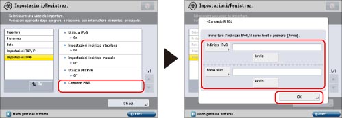Premere [Comando PING] per [Impostazioni IPv6] → specificare le voci indicate di seguito → premere [OK].
