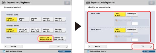 Premere [Specifica per numero di porta] per <Porta> → specificare <Porta locale> e <Porta remota> → premere [OK].