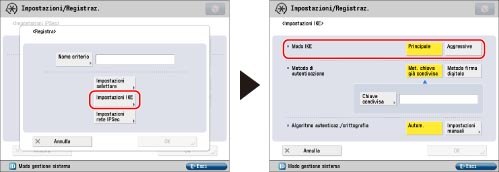 Premere [Impostazioni IKE] → selezionare il modo da utilizzare per la fase 1 di IKE.
