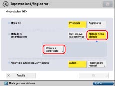 Premere [Metodo firma digitale] per <Metodo di autenticazione> → [Chiave e certificato].