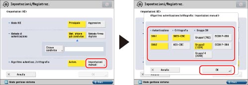 Selezionare [Impostazioni manuali] per <Algoritmo autenticaz./crittografia> → specificare l'algoritmo di autenticazione e protezione da applicare a IKE SA → premere [OK].