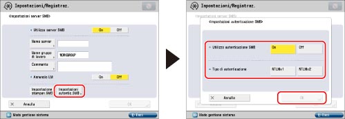 Premere [Impostazioni autentic.SMB] → specificare le opzioni di autenticazione SMB → premere [OK].