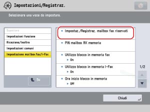 Premere → [Impostazioni funzione] → [Ricezione/Inoltro] → [Impostazioni comuni] → [Impostazione mailbox fax/I-Fax] → [Impostaz./Registraz. mailbox fax riservati].