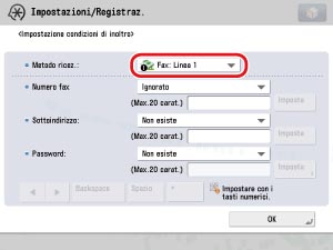 Per il metodo di ricezione, premere [Condizioni] → selezionare [Fax: Linea 1].